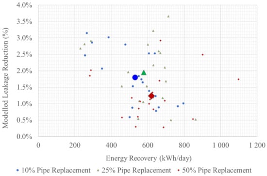 - The leakage reduction increased as pipe replacement increased for 10% and 25% pipe replacement. For 50% pipe replacement, the modelled leakage reduction reduces. With 50% of the network pipe replaced and in effect not being affected by energy recovery in terms of leakage reduction, this occurrence is validated;