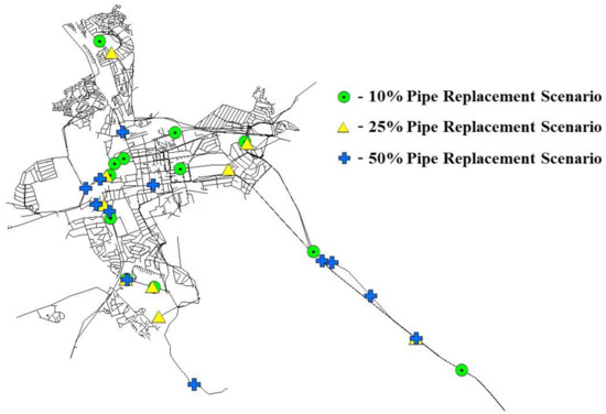 - The previous observation is reinforced by Figure 9, which shows the average distribution of solutions for the 50% pipe replacement scenario similar to the optimum solution for the base case scenario;