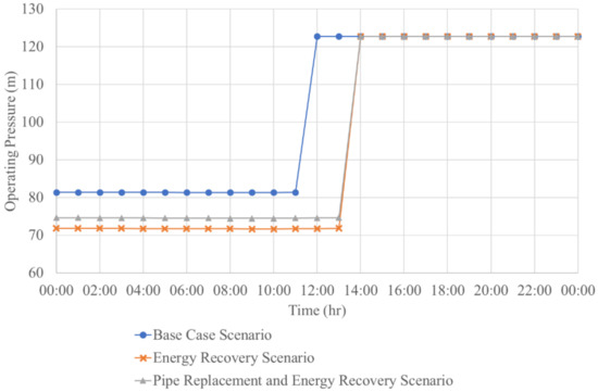 As it can be seen, the hourly averaged operating pressure, at the consumptive nodes in the base scenario operation of the Stellenbosch Town DMA, fluctuates between 50 and 55 m of pressure with minimum values obtained during the hours where the network demand is at the maximum. The Council for Scientific and Industrial Research [41] specifies the minimum residual pressure within the South African municipal water services environment as 24 m (2.4 bar) for house connections under instantaneous peak demand. So, it is clear that pressures within the system are above the minimum acceptable limit, and the potential excess pressure in the system could be exploited through ERD.