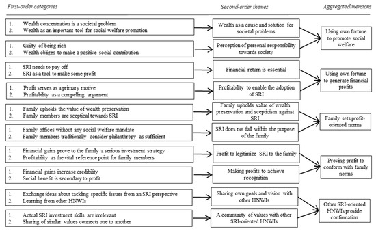 We processed additional data to identify the interaction between key constructs on the highest level of analysis leading to aggregate dimensions. More specifically, we categorized raw data, linked first-order categories to second-order themes, and aggregated them into third-order dimensions. The result was five aggregate dimensions: first, using one’s own fortune to promote social welfare; second, using one’s own fortune to generate financial profits; third, one’s family sets profit-oriented norms; fourth, proving one’s profit to conform with family norms; and fifth, other SRI-oriented HNWIs provide confirmation.