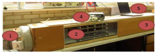 Testing rig (1. Exhaust fan; 2. Air-PCM unit; 3. Heating/Cooling unit; 4. Data logger; 5. Laptop) [23].