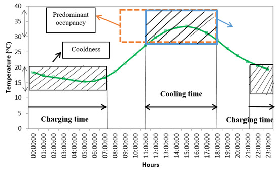 The design criteria of the unit considered the building occupancy and the thermal comfort (as described in Section 3.2). Matching these two criteria allowed to identify the required cooling demand and, more precisely, the required cooling period. Figure 3 displays a typical daily temperature profile during summer in Castelo Branco, Portugal [25] and considered for the design of the unit in Liu et al. [19]. This profile corresponds to average daily temperature observed in the Summer, namely between 21 June and 21 September. From Figure 3 it is observed that the PCM panels need to be fully charged (i.e., solidified) during nighttime: 21:00 to 07:00, when night temperature is below the melting temperature. While during daytime, between 11:00 and 18:00, the PCM panels need to be fully discharged (i.e., melted) to provide free cooling to the building. During this period, predominant occupancy is observed, and the external temperature reaches more than 30 °C (i.e., overheating period).