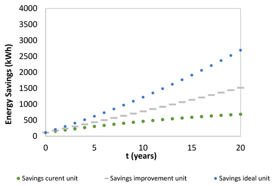 Energy savings for current air-multiple unit, improved unit and ideal unit.