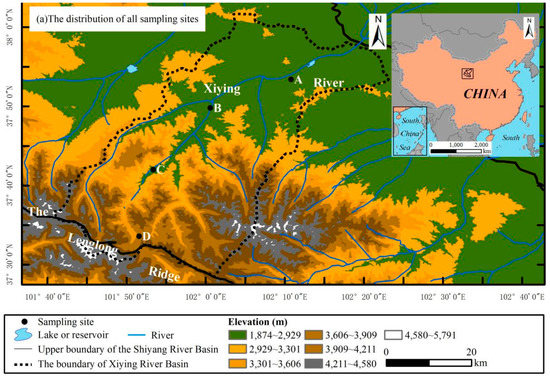 The study area is located in the Xiying River (XYR) basin in the Qilian Mountains (Figure 1). XYR is the main tributary of the Shiyang River. It originates below the glaciers in the northern slopes of the Qilian Mountains and eventually disappears into the desert. The elevation of the XYR basin ranges from 1510 to 4874 m above sea level. The average annual temperature is 6.3 °C and the average annual precipitation ranges from 200 to 700 mm [8,27]. The upper reaches of the Shiyang River basin are located in the East Asian monsoon crisscross zone, controlled by the East Asian monsoon and plateau monsoon. Cold high pressure appears on the plateau in winter, and the air flows from the plateau to the surroundings. In summer, hot low air pressure appears on the plateau, and the air flows from all directions to the plateau [6], which is a typical continental alpine climate. Vegetation is mainly distributed in areas between 2000 m and 3600 m above sea level; the basin is affected by multiple sources of moisture [6,27].