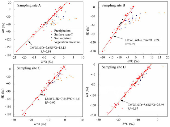 In sampling point D (River source), the δ2H and δ18O in different water bodies are similar. The δ2H and δ18O of soil moisture, vegetation moisture, and surface runoff of each sampling site fall to the lower right of the LMWL, indicating that different water bodies are all recharged by precipitation in the source areas, which is significantly different from sampling point A, B, and C.