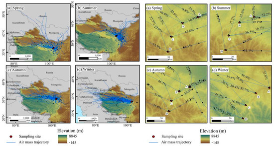 In spring (Figure 4a), the calculated contribution of recycled moisture in different sampling points was 9.9% and 16.5%, higher than that in other seasons. The contribution was largest in sampling point B (Arbor belt), and lowest in sampling point D (river source area). The melting of snow leads to higher soil moisture content in spring, which leads to higher evaporation of the soil. Plants at low elevations region begin to grow first in spring, which increases the vegetation evapotranspiration in the low elevation region. The portion of recycled moisture decreased with elevation increased (Table 2).
