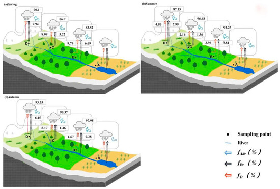 In autumn (Figure 4c), the contribution of recycled moisture in the study area varied between 2.05% and 9.63%, which is lower than in spring and summer. The contribution was highest at sampling point C (Shrub belt) and lowest at sampling point B (Arbor belt) the vegetation growth in the river source stagnated, and the soil began to freeze. The sampling point C (Shrub belt) has high evapotranspiration, and the evapotranspiration was reduced due to the lack of soil moisture in sampling points A and B.