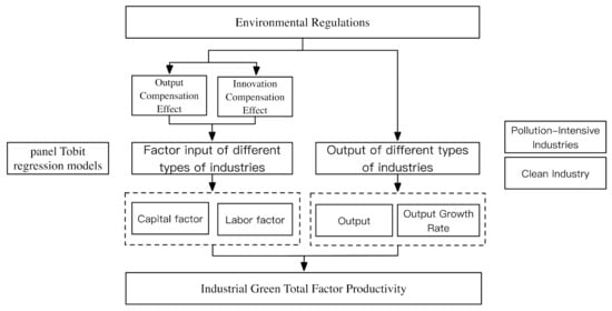 Increasing factor input can promote economic growth [10]. With the advancement of supply-side reforms, the contribution rate of factor input to economic growth has maintained a downward trend for a long period of time [11]. The core driving force of economic growth needs to transform to increase productivity gradually. Studies have shown that the increase in productivity of an economy comes from the increase in productivity in various sectors of the economy and the increase in allocation efficiency caused by the flow of production factors among various sectors. The “mushroom effect” of the allocation of production factors from low-efficiency industries to high-efficiency industries can promote economic growth [12], because the factor replacement effect can reduce the misallocation of resources and improve the average quality of input factors [13]. Therefore, structural adjustment between industries is as important as technological innovation within the industry. Promoting the effective allocation of production factors, such as capital and labor among industries, is an effective means to improve the efficiency of the entire economic allocation [14]. As a type of industrial policy, the purpose of environmental regulations is to improve the environmental quality while not reducing the level of economic development. Its essence is to promote the transformation of industrial structure through technological progress. Therefore, in the process of environmental regulations to promote industrial GTFP, the role of factor allocation cannot be ignored. The existing research on the impact of environmental regulations on industrial GTFP mostly focuses on the impact on technological innovation, ignoring that the preference of innovative activities for elements will promote the allocation of capital and labor among different industries. Due to the difference in pollution levels between pollution-intensive industries and clean industries, the actual effects of environmental regulations are also different. When the intensity of environmental regulations changes, factor input to different types of industries will change the factor allocation ratio because of the “prosperity to avoid disadvantages”, which will change the GTFP of each industry and gradually change the GTFP level of the entire industry. Then, changes in the ratio of factor allocation between industries will also change the size of the impact of environmental regulations on industrial GTFP. The conclusion that the effect of environmental regulation on industrial GTFP is mainly achieved through technological innovation holds for the industry as a whole. However, due to the differences in the level of emissions in each industry, there are also differences in the level of technology used to combat pollution, which leads to the fact that the effect of environmental regulation on industrial GTFP through influencing technological innovation differs between clean and pollution-intensive industries. Technological innovation is affected by factor inputs, leading to an increase in the level of technology with the increase of factor inputs within a certain range. It is assumed that the total factor inputs remain constant over a certain period of time. Therefore, the change in the proportion of factor inputs between industries is equivalent to the change in the amount of factor inputs in different industries. When the ratio of factor inputs among different industries differs, the level of technological innovation in the two types of industries changes, thus changing the impact of environmental regulation on industrial GTFP. This paper focus on the factor allocation between industries and comprehensively studies the GTFP effect of environmental regulation from the two aspects of input and output to the industry level. This research helps to intuitively reflect the impact of environmental policies on the transformation of industrial structure and provides references for the formulation of government environmental policies. The research method diagram is shown in Figure 1.