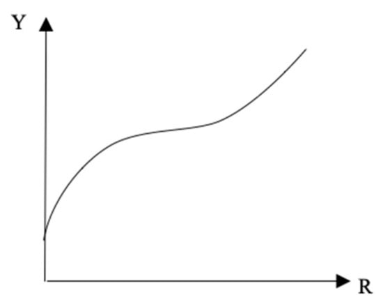 In the second term of Equation (23), increases with the increase of , and and are constants, so the term decreases as R increases. As increases further, the second term will gradually decrease to less than , so that will change from negative to positive. Therefore, when the intensity of regulation gradually increases, the output of clean industries will gradually increase, but its growth rate will first decline and then rise. Figure 3 shows the relationship between the intensity of environmental regulations and the output of clean industries.