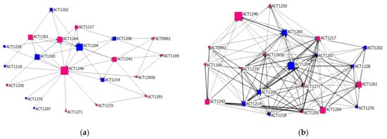 Consumption (a) and Friendship (b) networks. Colour: Gender (pink female, blue male). Shape: Consumption circle: non-consumer, square: consumer. Node size: eigenvector. Friendship network shows tie strength.
