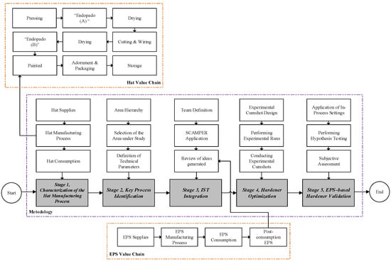 The following sections have been organized as follows: Section 2 describes the object of study, referring to the production process and the proposed methodological approach; Section 3 reports the findings found in each phase implemented from the characterization of the process to the optimization of the formula; Section 4 contrasts the results concerning the performance of the conventional hardener and the proposed one developed from post–consumer EPS, and discusses how the proposed methodological approach contributes to the competitive advantage of the industrial sector under study. Finally, Section 5 establishes the Conclusions and highlights the industrial contribution and the integration of the value chains of the hat artisanal industry and the styrofoam industry.