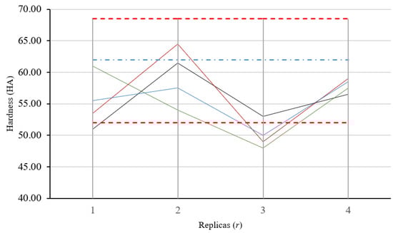 The values of the replicas described in Table 4 show that with a greater amount of solvent and a lower amount of solute, there was better hardness obtained in the hat; on the contrary, with a lower the amount of solvent and greater amount of solute, a lower hardness was obtained. Among the replicas, it can be seen that the third replica (r3) presents a hardness of 61.00 HA with 1:A = 7.5 and 2:B = 40, while with 1:A = 7.5 and 2:B = 60 in replica number two (r2), there is a hardness of 64.50 HA; in general, the factor A, at a low level, allows for obtaining greater hardness, which is explained by the porosity of the hat; when the mixture is aqueous it adheres better on the membrane of the surface of the hat. However, for this study, the hat must also meet the quality perceived by the client, which in this case means that a nominal value is better as a quality characteristic. Figure 2 shows that the replicas in the second run are in the vicinity of the nominal value (NOM) of the Nitrocellulose-based hardener. It should also be noted that even if the range of the solvent–solute ratio is smaller, there is an approximation of hardness to the nominal value, even with approximate values between them. These results allow us to infer that the best hardness of the product is achieved when the proportion of composition of the solute in the equation is greater than 7.5 but less than 15.0 when the base of the solvent (B) is maintained at 60.