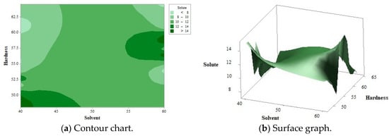 The solvent contributes, but does not determine the hardness as reflected by the solute (see Figure 3). However, the behavior in terms of the combination of factor levels indicates that, at certain levels of solute and solvent, the same hardness is achieved: i.e., if the solvent is between 40–45, a solute of 8 is convenient, while if the solvent is located between 45–57, the solute would be 10–12; if the solvent is 57–60 then the solute would be 8–10. A zone of solute 12–10 with solvent 60, on the other hand, should be avoided, as it provides a hardness of less than 50 HA.