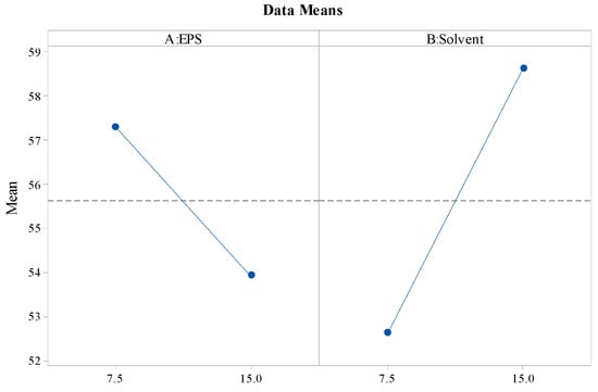 with an R2 of 93.09%; however, from the analysis of means (see Figure 4) it is shown that the levels that optimize the parameters of the formulation of the mixture are post–consumption EPS at Low level (15 g) and Solvent at High level (60 mL), in addition to other compounds (not described due to “industrial secrets” of the company), with an average hardness of 62.60 HA, since A: Low = 57.31; A: High = 53.94; B: Low = 52.63; B: High = 58.63. Figure 4 shows the behavior of the effects of the factors under study on hardness (HA); the graph shows that with a greater the amount of solute, the hardness is lower, while with a greater the amount of solvent the hardness increases.