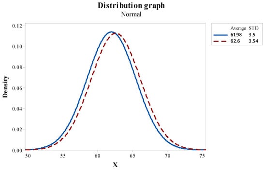 Therefore, it is possible to establish statistically that both Endopado processes come from the same population and are considered to have the same quality. The quality measured as hardness (HA) provided by the post-consumer EPS-based mixture is the same as the one presented by the nitrocellulose-based mixture (see Figure 5). Figure 5 shows the probability distribution of the hardness (HA) of the actual process using the conventional nitrocellulose-based hardener against the probability distribution of hardness (HA) considering the post-consumer EPS-based hardener. The “x-axis” represents the hardness, while the “y-axis” represents the probability density of the interest variable f(x).