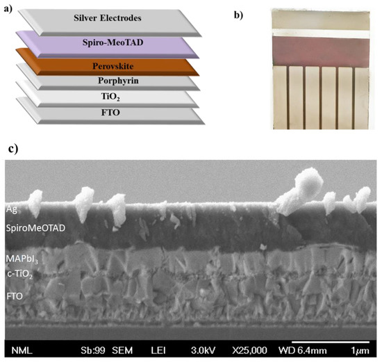 Fluorine-doped tin oxide (FTO) conductive substrates were cleaned thoroughly by sequential 15 min ultra-sonication baths with Hellmanex, 2-propanol, and acetone. Before the ETL’s deposition, the FTOs underwent UV ozone treatment for 15 min. For the compact layer, a solution of titanium (IV) isopropoxide in ethanol was spin-coated at 2000 rpm for 60 s and the resulted TiO2 films were annealed at 500 °C for 45 min with a temperature ramp rate of 5 °C min−1. For the modified films, manganese porphyrin was diluted in methanol, resulting in a solution of 0.5 mg mL−1, and was spin-coated at 2000 rpm for 40 s on top of the TiO2 films. The perovskite solution and the HTM solution were prepared and deposited into an argon-filled glovebox. For the perovskite solution, 40 wt % of methylammonium iodide and lead acetate trihydrate were diluted in anhydrous DMF in a 3:1 molar ratio and a small amount of hypophosphorous acid (50% w/w, aqueous solution) was added at the end. The perovskite solution was spin-coated on the ETLs at 2000 rpm for 45 s. The obtained films were left to dry at room temperature for 10 min and afterward annealed at 100 °C for 5 min. After cooling down, a 70 mM Spiro-MeOTAD solution in chlorobenzene, containing additives of lithium bis-(trifluoromethanesulfonyl) imide lithium salt in acetonitrile, 4-tert-butylpyridine and FK209 Co(III) TFSI salt in acetonitrile, was spin-coated at 4000 rpm for 10 s. Finally, 100 nm of patterned silver electrodes were thermally evaporated under a 10−6 Torr vacuum at a ∼1 Å s−1 rate. Figure 1 Cross-section SEM image (Reprinted with permission from [13]. Copyright 2020 American Chemical Society) shows the schematic illustration, an optical image and a cross-section SEM image of the obtained devices.