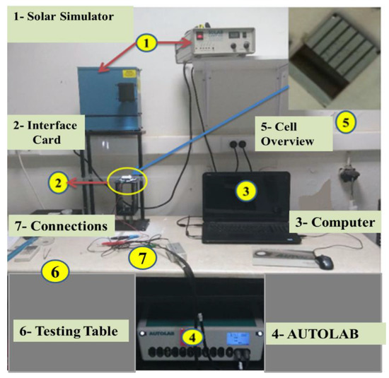 The devices were characterized electrochemically using a solar simulator (Solar Light Company, Inc. (Glenside, PA, USA) 300 W model 16 S-300/1 sun, AM 1.5 D, 1000 W m−2) as the illumination source and an Autolab PG-STAT-30 potentiostat to obtain the current−voltage (J−V) curves with a scan rate of 50 mV s−1. In addition, electrochemical impedance spectroscopy (EIS) measurements were carried out under dark and 1 sun illumination conditions using the PG-STAT-30 potentiostat and its built-in frequency response analyzer (Figure 2). The UV−vis absorption spectra were recorded with a PerkinElmer LAMBDA 40 UV−vis spectrometer. In [13], all the details about the fabricated devices performance are discussed.