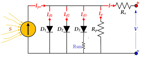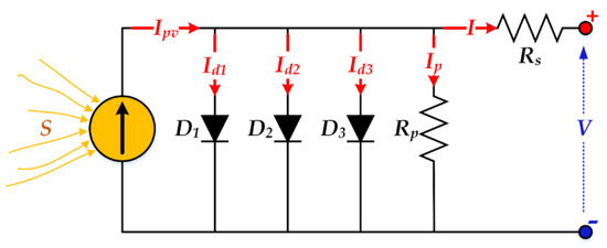 where Ipv denotes the photo-generated current. ID1, ID2, ID3 denote the current in the first, second and third diodes, respectively. Rs is the series resistance. Rp denotes the shunt resistance.
