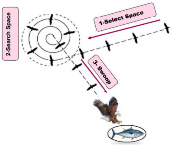 Bald Eagle Search (BES) is a novel nature-inspired search optimizer. It is a meta-heuristic algorithm based on applying intelligent strategies to hunt the fish. The bald eagle depends on intelligent social behavior to reach the best goal based on three stages. The first stage is the selection of the hunting area which contains the greatest number of fish. Searching in the hunting area is the second stage. In this stage, the eagle moves inside the space to search for fish by identifying the best position to hunt the prey. In the third stage, the eagle uses the position selected from the second stage and determines the best point to hunt. This stage is known as swooping. Swooping begins from the best point to hunt and all other movements are directed to this point. Figure 5 describes the three stages of BES [16].