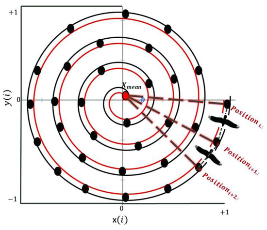 After selecting the search area, eagles move spirally in different directions within the selected search space, as shown in Figure 6. The best position of an eagle for the swoop is represented mathematically as: