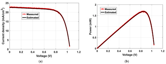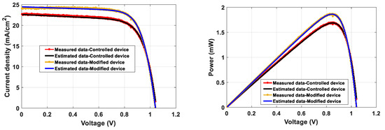 The comparison between experimentally obtained and estimated I–V and P–V curves for both control and modified devices used in this study are shown in Figure 8, Figure 9 and Figure 10. The comparison revealed that the experimental obtained and estimated I–V and P–V curves are almost identical, which is an indication of the efficiency of both the suggested model and the optimization algorithm in simulating the performance of the PSCs. The estimated parameters of the PSCs are matched very well with the experimental ones. From previous discussion for Table 1, Table 2, Table 3 and Table 4, applying BES algorithm in this study for PSCs parameters estimation via both TDM and MTDM provides the best performance results at minimum errors.
