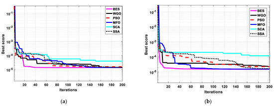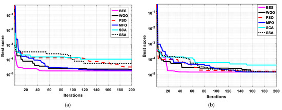 The convergence curves through the parameter identification process of both control and modified devices based on both TDM and MTDM per applying different optimizers are summarized, respectively, in Figure 11 and Figure 12. From these figures, it is obvious that the proposed BES algorithm performance is the best among the other used algorithms. The fast convergence and the lowest cost function resulted from the BES algorithm in all studied cases, which is proof also of the superiority of the BES in comparison with the other optimizers used in this study.