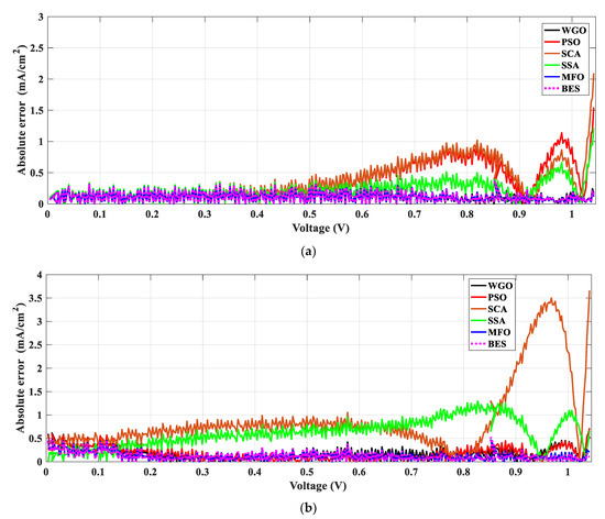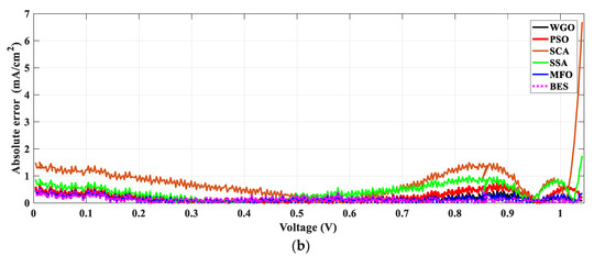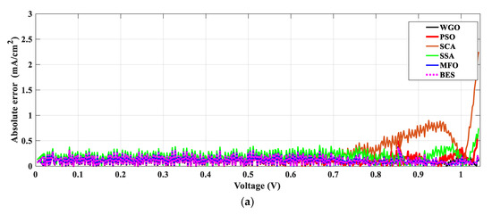 Further investigation of absolute current density error for both control and modified PSCs devices via using different optimization algorithms applying both TDM and MTDM, as explained in Figure 13 and Figure 14, respectively. It is very easy and clear to notice that the proposed BES in both devices, and under both TDM and MTDM, has the highest coefficient of determination and the lowest mean absolute error values. This also proves the accuracy, superiority, and efficiency of the suggested BES algorithm in estimating the best parameters of both control and modified PSCs devices in both TDM and MTDM.