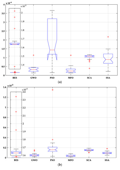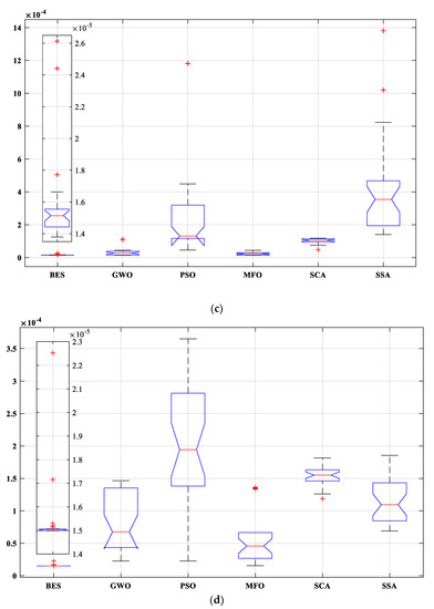 To prove the consistency of the proposed strategy, ANOVA test has been performed. ANOVA test results are provided in Table 9, and its related graphical ranking is illustrated in Figure 15. According to these results, the p-value is much lower than the F value that confirms the difference between the provided performances. From Figure 15, the BES can provide the optimal performance in terms of mean fitness. Moreover, its variations range is the lowest comparing with the other algorithms, which demonstrates its robustness.