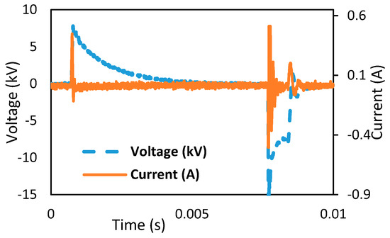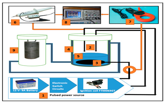 This experimental work sets a high-voltage conductor over the wastewater, whereas the ground was set inside the wastewater. The gas-liquid electrical discharge system utilized as a part of this study consists of dual-pin anodes. Dual-pin terminals were joined with a high voltage while the plate was ground. Computer-controlled chemical reactors (CEXC) with a continuous blended tank reactor were used in the corona discharge plasma reactor. The reactor has a diameter of 100 mm with a height of 180 mm and an exterior skeleton width of 120 mm. Figure 2 represents a diagram of the experimental work and the corona discharge plasma system. The high-voltage electrode pin’s diameter is 1 mm, and its height is 3 cm. The space between the two pins is 50 mm, notwithstanding that the ground conductor is a cubic measuring 5 cm × 6 cm × 0.02 cm, with an aggregate exposed range of 30 cm2. An excitation voltage of 15 kV from the FTM063GT-GC5MIC2000 Ignition Coil was linked to the pin. Tektronix P6015A was used to measure an excitation voltage waveform. Moreover, Tektronix A6021 (Portland, Oregon, USA) current probe was used to determine the current waveform, and Tektronix TDS2014 digital storage oscilloscope was used to view the voltage and current waveforms. Figure 3 displays the voltage and current sequences of the gas–liquid corona discharge plasma reactor. The high-voltage and ground conductors of the distinct radii of shape separated by a 0.5 cm air gap were considered the finest distance from the simulation work. The high voltage of 15 kV with a time of 10 ms, frequency of 100 Hz, positive width of 8.615 ms, negative width of 1.376 ms, and the rise time of 70.46 µs were also considered [9,10,11,12,13,14]. The schematic setup is displayed in Figure 4, demonstrating all the items used in the corona discharge plasma system. The absorption light for the dye solution before and after the trial was estimated by HITACHI U-3900 UV (Hitachi, Chiyoda, Tokyo, Japan) spectrophotometer at 600 nm wavelength.