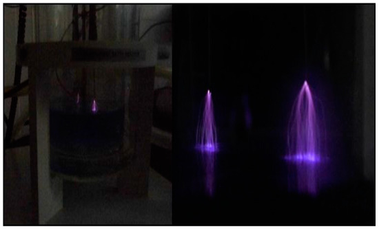 In the tests, the temperature of the wastewater solution was kept up at 278, 288, and 298 K by the corona reactor unit and at 308, 318, 328, 338, 348, and 358 K using the CEXC chemical reactors service unit as a cooling and heating water bath control. Figure 5 shows the image of corona discharge from the dual pin-to-plate electrodes [13,14].