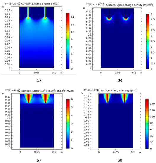 Simulation results of dual-pin corona discharge plasma reactor. (a) Electric potential (kV); (b) surface charge density (mC/m3); (c) electric field distribution (V/m); (d) energy density (J/m3).