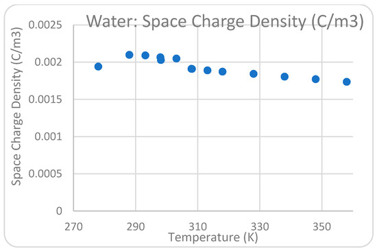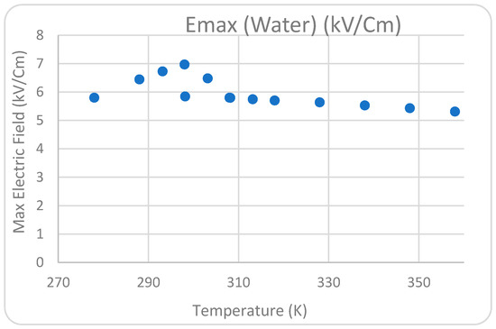 Figure 7a shows that the shaded plots of the potential distributions in the region of the high-voltage electrodes are thick with a rounded form, creating an exceptionally high and consistent electric field around the electrodes, and thin with a circular form while moving near the ground plate. The most remarkable voltage appropriation thickness is moved in the zone near the corona electrodes. Thus, the dynamic species accomplish most of their charge in this zone, acting toward the grounded gathering plates, as shown. The space charge density distribution is presented in Figure 7b. The charge density of species is concentrated in the air gap region above the polluted water and inside the interference between the wastewater and air interface. The graph shows that no electrical field is present inside the rod. However, the electrical field is at its greatest strength or Emax at the tip of the rod. The field lines have a considerable influence on corona discharge plasma formation, as shown in Figure 7c. The electric field must be strong enough to create electrons from all types of collisions and produce the chain reaction (photoionization, ionization, and electron emission from cathode). In addition, the electric field accelerates the active radical species in the gap between two conductors, avoiding the recombination of electrons and ions. The 2D simulation approach was employed to determine the electric field intensity in the reactor. The figure shows the electric potential conveyance in x = 0 plane of the corona discharge plasma reactor if the conductor electrode is energized with a voltage of 15 kV. The energy density distribution is presented in Figure 7d. The influence of the varying water temperatures between two corona electrodes from 278 K to 358 K on the greatest electric field measured near the point of high-voltage conductors was examined. Figure 8, Figure 9, Figure 10 and Figure 11 show that the temperature satisfies the space charge density and the maximum field intensity in the air and water regions. The position of the maximum point of the electric field at the tip of the pin conductor is the same for all cases at each analyzed decolorization period. The electric field surrounding the sharp pins has a high value when compared with the rest of the system, indicating that that location can be a plasma region with a high corona discharge. This conclusion is consistent with the experimental work conducted to investigate the influence of temperature on dye removal from polluted water. According to the 2D simulation model conclusions, the optimal water solution temperature between the high-voltage and ground conductors for considerable corona discharge is 298 K.