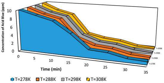 The influence of temperature degrees on organic dye degradation is critical in the wastewater treatment technique. Therefore, the color removal of polluted water with Acid Blue 25 dye was studied with varying temperature degrees from 278 K to 318 K, as shown in Figure 6. The measurements were taken under constant dye concentrations (10 ppm) at pH 6.
