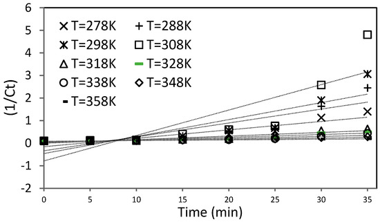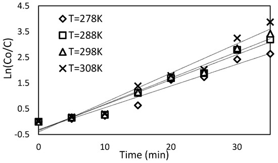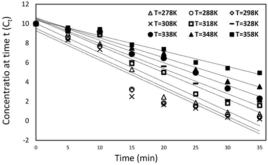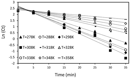 Figure 12 shows the relation between the ratio of concentration and time for different solution temperatures from 278 K to 308 K. The Ln (K) plot with the (1/T) is presented as a straight line by applying the Arrhenius equation because of the natural logarithm, as exposed in Figure 13 and Figure 14. Therefore, the activation energy may be simply estimated using the line’s slope = −(Ea/R) and then Ea = 6.750 kJ/(mol K). On the contrary, an opposite behavior is detected at a temperature higher than 308 K. The initial dye concentration is reduced by lowering the dye solution temperature from 318 K to 358 K, as shown in Figure 15.