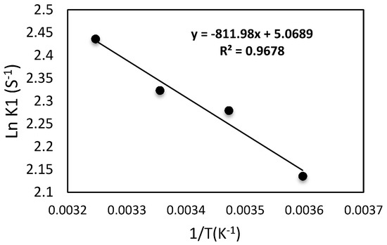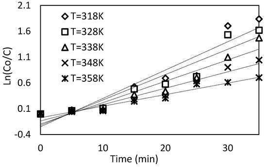 Figure 15 shows the relation between the ratio of concentration and time for different solution temperatures from 318 K to 358 K. The Ln (K) plot with the (1/T) presents a straight line by applying the Arrhenius equation because it is taking the natural logarithm as exposed. The activation energy may be simply estimated using the line’s slope = −(Ea/R) and then Ea = −20.94 kJ/(mol K).