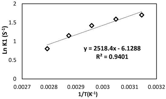 Chemical reactions occur quickly at high temperatures. The reason behind this observation is not complex. Thermal energy has a strong relation to movement at the atomic level. As the temperature increases, molecules transfer quickly and collide aggressively, incredibly improving the probability of bond cleavages and rearrangements. Chemical reactions are predicted to proceed quickly at high temperatures and slowly at low temperatures [26,27,28]. Arrhenius equation is a model for temperature-dependent reaction rates. Svante Arrhenius, Father of Physical Chemistry, presented a mathematical statement in 1889. He recommended such an equation for the rates of forward and reverse responses. Arrhenius provided physical evidence and an understanding of an experimental relationship. It can be utilized to display the temperature variety of diffusion coefficients and other numerous thermally actuated procedures/reactions [21,22,23,24]. The activation energy, Ea is the lowest energy that the molecules need to react and generate a product. The slope of the Arrhenius plot may be used to calculate the activation energy. Arrhenius relation depends on collision theory. It expresses that particles must collide with enough energy and in a suitable direction. The actuation energy and preexponential factor are obtained from the Arrhenius plot. Thus, the rate, steady at any temperature utilizing the Arrhenius equation, can be unraveled. Equations (6) and (7) are used to define the Arrhenius equation.