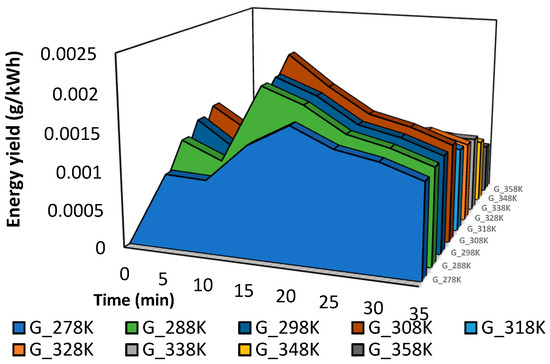 The relationship between time and energy yield (g/kWh) under different temperatures of polluted water with Acid Blue 25 dye is presented in Figure 18. The energy yield increases with the increase in the temperature from 278 K to 308 K. Then, it is reduced with the increase in the temperature from 318 K to 358 K. In the case of corona discharge plasma hitting liquid surfaces, the energy yields for 50% color removal in 15 min are high, and the best condition can affect hundreds of grams per kilowatt-hour (g/kWh).