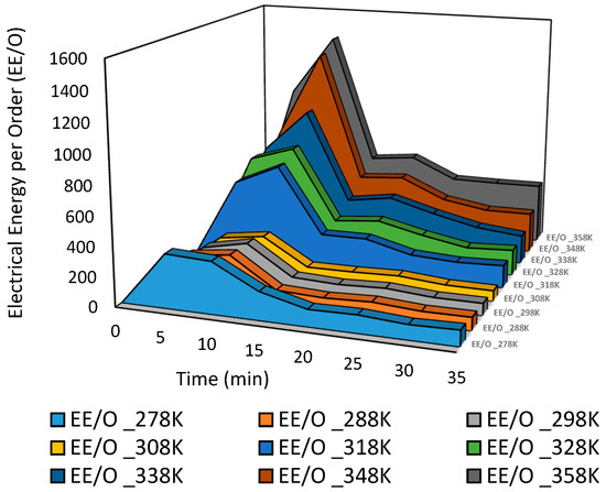 Equation (9) was used to compute the EE/O, with the starting quantity of water of V0 = 100 mL, initial concentration of Ci = 10 ppm, the end concentration at each temperature degree, and the reactor power determined from creating the voltage and current. The power dissipated on the ignition coil, and the electronic circuit was meant to be ignored. Thus, the power used in the release was approximately equal to the power input. Figure 19 depicts the relationship between time and EE/O for polluted water with Acid Blue 25 dye at various temperatures. EE/O increases as the temperature increases from 278 K to 358 K during a 10-min treatment period; then, it steadily decreases. If established, the EE/O provides the industry and potential workers with a standardized objective foundation for assessment. This EE/O is commonly utilized for states with a low early concentration [30,31].