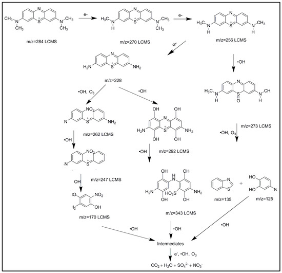 Acid Blue 25 dye degradation in wastewater using corona discharge plasma follows several mechanisms. One of the proposed mechanisms is the formation of active radicals above the water, passing some intermediate components. The hydroxyl group may play a vital role in the degradation process [32,33,34,35]. The deterioration of Acid Blue 25 dye via corona discharge plasma is illustrated in Figure 23. The corona discharge plasma uses choline lactate for efficient dye deterioration. A considerable amount of varied and effective species and radicals is formed during the corona discharge. Water atoms provide abundant supplies of different reactive nitrogen and reactive oxygen species, including hydroxyl radical (OH•) and hydrogen particles (H). Ozone (O3), singlet oxygen (O), hydrogen peroxide (H2O2), hydroperoxyl radical (HO2), and superoxide radical (HO2) are produced by nonthermal plasma corona in wet air (O2−). Experiments revealed the ions created by the corona discharge plasma and other breakdown products. Essential oxidants, such as ozone and H2O2, are notable because they can be converted to free oxidants, such as OH radicals. Ozone is the most economically accessible oxidizing specialist, and it is commonly used to treat water for odor and taste elimination. Among the basic oxidizers, only the hydroxyl radical and fluorine have a higher oxidation potential than ozone. The creation of hydroxyl (OH) radicals that occur as ozone decays positively affects its use. Ozone is a potential oxidant (Eo = 2.07 V) that reacts with various organics in either immediate or abnormal ways (principally hydroxyl radical). Ozone can indirectly deliver free radicals (OH•, Eo = 2.80 V) that can react with almost all natural mixtures. Free oxygen radicals are first produced via inelastic collisions. Then, the reactions of these free radicals produce ozone. This section elaborates the essential active species generated in corona discharge plasma and how they were measured under the influence of 15 kV corona discharge plasma reactors [36,37,38].