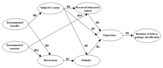 This study developed an extended TPB model that integrated the TPB, the NAM and Vroom’s ET. We analyzed the influences of social–psychological factors on urban residents’ intention to garbage sorting in pilot cities in China. The main conclusions were as follows. First, the explanatory ability of the extended TPB for garbage sorting intention was 31.9%. Second, new insights were found and confirmed regarding the relationship between expectation and intention to garbage sorting. The expectation significantly positively affected the intention to garbage sorting. Third, our research highlights the importance of environmental benefits and concerns as antecedents affecting subjective norms, moral norms, perceived behavioral control and expectation by empirically demonstrating that urban residents deriving higher environmental benefits and having greater environmental concerns have higher expectations and intentions to garbage sorting.