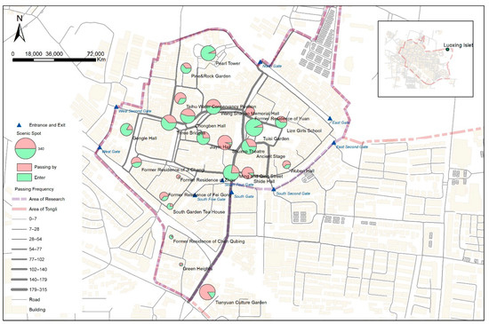 The interviews were conducted from summer 2017 to spring 2019 with a sample of 277 tourists, and 272 of them gave effective responses. The sample was composed of 44.4% males and 54.9% females (0.7% no information), and the majority were below 30 years old (77.9%). Figure 3 shows their behavior map in Tongli Ancient Town, which contains information of attraction choice and route choice. The thicker the road segments are, the more often they were chosen. Each pie chart reflects the frequency of an attraction passed (red) or entered (green) by the tourist sample. The larger the pie charts are, the more popular these attractions are. Zhongchuan Road is the most visited road segment by the tourists. The roads connected directly with Zhongchuan Road come next, especially those where Chongben Hall and Three Bridges are situated in. The chances are higher that the attractions along those roads are entered or passed by tourists.