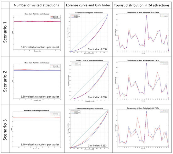 Based on the simulation approach, our study designed four scenarios to check the effects of three management strategies, which were proposed from the investigation to managers of Tongli Ancient Town (Table 3). The first scenario is the benchmark scenario, which just uses current environment features as a reference. Scenario 1 is to see the effects of adjusting the importance of gates. The percentage of tourists entered from the East Gate and the Wet Gate is set to 40% each. Scenario 2 is to see the effects of improving overall walking environment, such as greater pavement or sanitation. We assume the parameter of walking distance is 0.9 times of the original value. Scenario 3 is to see the effects of improving the attractiveness of rarely visited attractions. A series of adjustment including setting additional check-ins, improving the online comment rate, and attracting specific tourist segments are made. The simulation results are helpful for fostering policy makers’ understanding and prioritizing interventions by providing tourists with services in line with their preferences.