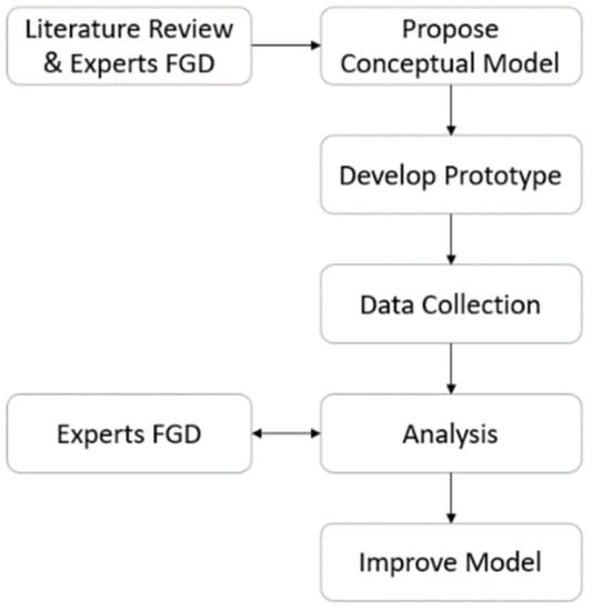 This study is built upon recent reviews of e-health and customer empowerment in healthcare organizations to develop a model. It employed thematic analysis, a qualitative method for identifying, analyzing, and reporting on patterns found in text data [54]. Thematic analysis requires a thorough reading of the data and the identification of patterns, including explicit and implicit meaning embedded within the text [55]. The relevant journals (EBSCO, ProQuest, Emerald, Insight, Science direct, Taylor and Francis, Wiley, JSTOR, and IEEE) search was conducted using keywords healthcare AND empowerment, social networks, Electronic Medical Records (EMRs), and Electronic Health Records (EHRs). These articles were reviewed to extract the issues and definitions of patient empowerment in an e-health setting. Three module components of the proposed e-health systems were identified based on the thematic analysis (personal, social network, and medical). Embedding social network features in e-health can empower patients to exchange information value among patients with similar conditions. Medical empowerments are derived from enabling EMRs’ to be accessible to patients, and personal health empowerment is derived from EHRs data availability. It is mostly generated on a thorough review of the literature and experts in the field via Focus Group Discussion (FGD) in the domains of health information systems and health practitioners and the outcomes of the first conceptual model. The concepts were then prototyped for testing and data collection in the field. The results were presented to experts in a second FGD, and the proposed model was fine-tuned because of the feedback (see Figure 2). Respondents for this study were recruited from patients who utilized the prototype devices using the purposive sampling method. The data collection phase measures the actual versus expected outcome of the system. A private clinic in Indonesia has been chosen for the testbed of a prototype. The reasons were because the medical staff supported the systems and recommended participants to use the systems in real healthcare scenarios. In exchange, participants benefited from free health treatment as well as e-health services during the testing period (2015–2016) at the clinic.