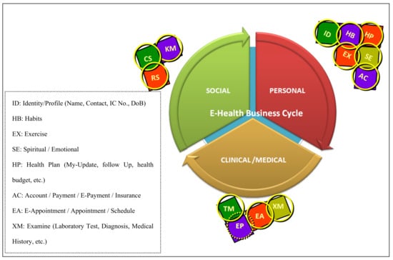 Figure 6 shows the cycle of the social life of an individual or patient. Social life refers to the customer’s social activities. Healthcare organizations must consider the adoption of social networks in their organization as tools for a strategy to maintain long-lasting relationships with their patients, especially in a competitive environment [60]. E-empowerment is considered a process of conversation and communication through social networks in which experiences, values, and supports are expressed in informal ways. With the Web 2.0 technologies, all types of interactions can generate conversations and supports that benefit both customers and healthcare providers in creating a sales, marketing, and customer service strategy.