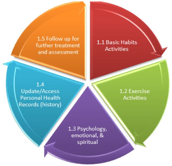 This section discusses the business model and scenario to present insights on the mHealth process in the context of user participation and interaction. The model accommodates different dimensions of personal health activities, social network participation, and electronic medical records. The circular structure of the primary activity categories captures the cyclic nature of the entire dimensions set. It displays a three-dimensional design that deconstructs the e-health scenario to simplify the business model. Patients’ roles are divided into three categories in the model: individual activities, social engagement, and electronic medical empowerments. Because of the modular design, each job consists of several subclasses that detail the function and organized activities within the e-health context between users and healthcare providers. The modular approach has the advantage of being extendible, allowing new modules or sub-modules to be easily integrated into future healthcare needs.