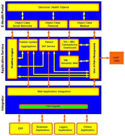 The proposed systems’ front-end architecture is shown in Figure 7. It considers Electronic Health Objects (EHOs) as collections of objects with their inherent attributes and behaviors, allowing users to interact and generate data. The architecture’s business model is governed by the E-Health portal, which combines public health promotion, personalized displays of the right information to the right users at the right time, customizable sites where users can create custom pages, social networking platforms, and interactive medical information.