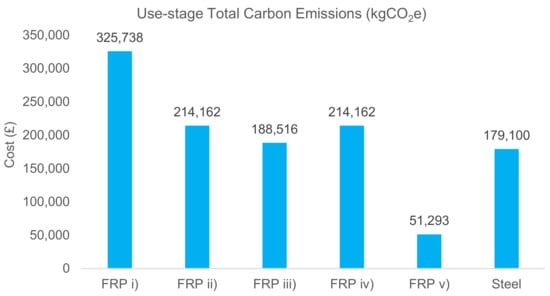The whole life cycle costs for the two bridge designs are compared in Figure 6. The main difference between the FRP scenarios is the use stage, and therefore FRP (iii) and (iv) were not included due to similarities in this stage to FRP (ii). As expected, the use stage has the largest impact on the whole life cycle carbon cost.