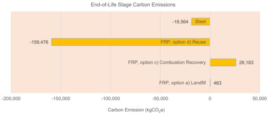 Figure 5 presents estimations of carbon emissions of the steel bridge and the possible FRP options for the EoL stage. The most sustainable option is being able to re-use the FRP bridge in its entirety for another construction scenario. It should be noted that although the option for combustion has the highest carbon emissions, 26,054.2 kgCO2e, this option produces 308,637.8 MJ.
