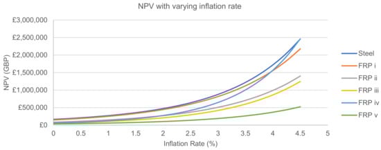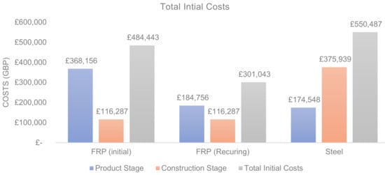 For the LCC, production and construction costs were combined. As previously mentioned, the FRP bridge has a high preliminary cost due to the development of moulds and patterns, and this cost is reflected in Figure 7 with the additional development costs at the product stage being 199% greater. The cost at the product stage is GBP 193,608 higher for the FRP bridge than that of steel for the product stage; however, significant cost savings are achieved in the FRP bridge at the construction stage. The construction of the FRP bridge costs 31% of the cost of the steel bridge’s construction; this FRP cost saving outweighs the material and production costs, as shown by an overall reduction in the combined costs. The saving is less for the initial FRP bridge but still significant: GBP 66,044. However, as noted by Ciria [19], a problem with FRP materials is that they are specialist, and if the bridge needed to be replaced in 40 years’ time, the moulds and patterns may need replacing.