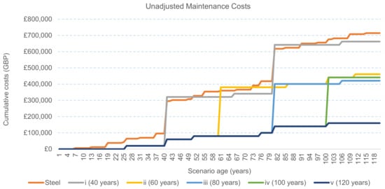 To establish the general trend for the expected maintenance, the cumulative maintenance costs for each scenario at a fixed present cost (no inflation) are compared in Figure 8. As expected, for the 40-year FRP bridge, scenario (i), the total maintenance costs are significantly high due to the costly multiple reconstructions of the bridge. Interestingly, due to the similarities in the construction cost for the FRP bridge and the cost of significant repairs for the steel bridge, scenario (i) and steel have similar cost patterns. As expected, scenario (v) where the bridge lasts the full 120 years has the smallest projected costs.